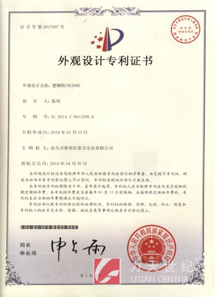 产品名称: 塑钢椅(NC508)外观设计专利证书 |